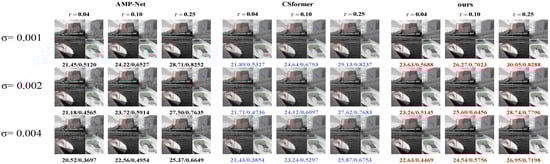 We evaluate our method’s robustness against measurement noise using the BSD100 dataset. Our experiments introduce Gaussian noise with different variances at various sampling rates (). Table 3 presents the quantitative comparisons between SSM-Net, AMP-Net, and Csformer under these conditions.