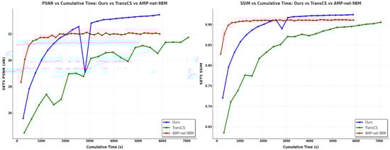 Our SSM-Net achieves faster convergence compared to TransCS, reaching stable PSNR and SSIM values within approximately 3000 s. In contrast, TransCS requires nearly 5000 iterations to achieve comparable performance levels. While AMP-Net converges slightly faster, reaching stability at around 2000 s, its final reconstruction quality is notably lower than that of SSM-Net. For example, at sampling rate , SSM-Net achieves a dB PSNR improvement over AMP-Net after convergence.