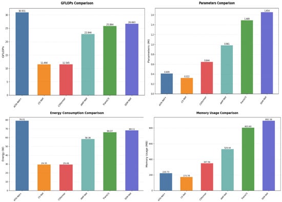 Comparison of GFLOPs, parameters, memory consumption, and energy consumption for a pixel image with .