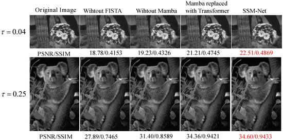 Figure 7 and Table 5 show the results of the ablation study, which evaluates the impact of removing the FISTA algorithm and the Mamba module on image reconstruction quality and computational efficiency. We compare three configurations: SSM-Net (full model), without FISTA, and without Mamba, as well as Mamba replaced with Transformer.