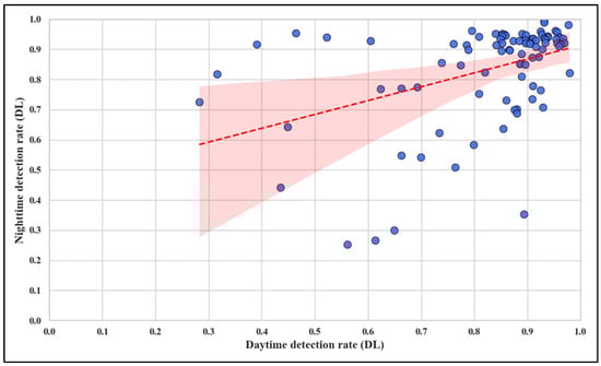 Table 2 presents the distribution of detection rates between day and night, highlighting the model’s ability to perform consistently under varying lighting conditions. The detection rate during the day shows a mean of 0.82 with a relative standard deviation (RSD) of 22%, while the night detection rate has a slightly higher mean of 0.83 and a lower RSD of 20%. This minor variation implies that the model performs reliably under both conditions.