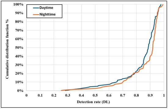 32]. The steeper cumulative distribution curve for night-time detection rates (