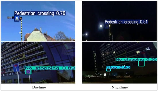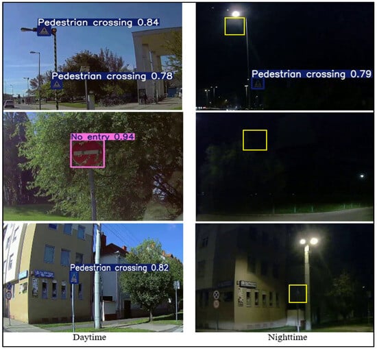 The detection rate refers to the maximum percentage of traffic signs correctly identified and classified by a detection model (YOLOv8) within a specific set of conditions. This metric evaluates the model’s peak performance in accurately detecting traffic signs. The detection rate of traffic signs by AV systems varies significantly between day and night due to differences in lighting conditions. During the day, traffic signs are generally more visible, resulting in a higher detection rate. Natural lighting enhances the clarity and contrast of the signs. In contrast, night-time conditions pose challenges such as reduced illumination, glare from external light sources, and partial occlusion, which can obscure sign details and reduce detection accuracy.