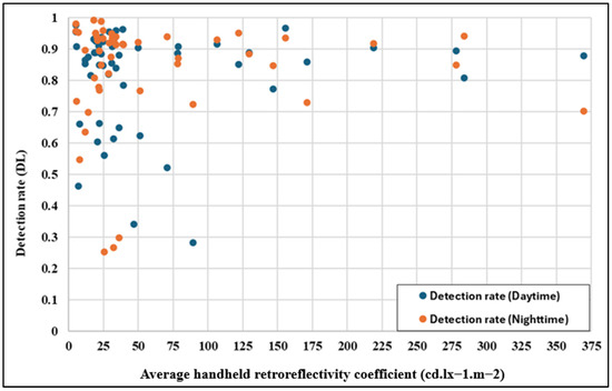 In contrast, RA2 signs exhibit significantly higher retroreflectivity, with a mean Ra of 187 cd. lx−1.m−2, an STD of 89.9 and an RSD of 48%, demonstrating better reflective properties despite moderate variability. The detection rate during the day for RA2 is 0.88, with a very low STD of 0.06 and an RSD of 6%, indicating remarkable stability in daytime performance. RA2 signs maintain excellent performance at night-time, with a mean detection rate of 0.87, an STD of 0.08, and an RSD of 9%. This stability highlights the direct correlation between the higher retroreflectivity and consistent detection performance across varying light conditions.