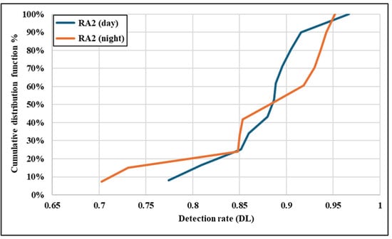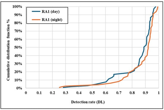 Figure 14 presents the CDF for RA1 detection rates under daytime and night-time conditions. The daytime CDF shows a gradual slope, with detection rates steadily increasing and reaching values close to 0.98. This indicates that RA1 traffic signs generally achieve moderate daily detection rates despite their lower retroreflectivity (mean Ra = 29). However, the night-time CDF exhibits a steeper slope, with detection rates starting much lower (around 0.25) and displaying significant variability. The slower growth and broader spread of detection rates reflect the difficulty of detecting RA1 signs under low-light conditions due to an inadequate retroreflective performance. This highlights the limitations of RA1 materials, where low Ra values result in a reduced and less reliable detection performance, particularly at night.
