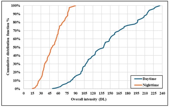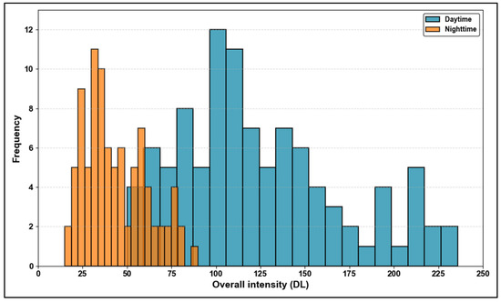 The statistical analysis clearly contrasts the daytime and night-time overall intensity values, as shown in
