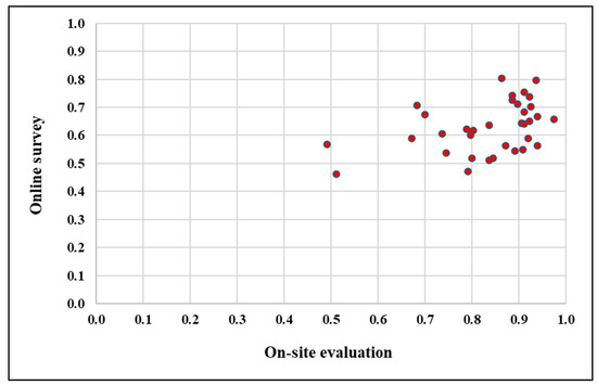 Evidence of this disparity appears in the clustering of higher scores. The on-site evaluations frequently produced ratings exceeding 0.90, whereas the online survey rarely exceeded this threshold. Conversely, when the on-site scores were in the lower range (e.g., below 0.60), the online scores were more closely aligned, indicating the consistent underperformance of online scores relative to their on-site counterparts across most ranges.