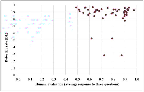 Figure 19. This implies that higher human evaluation scores are generally associated with a better detection performance, reflecting the system’s effectiveness when rated more favorably by human evaluators.