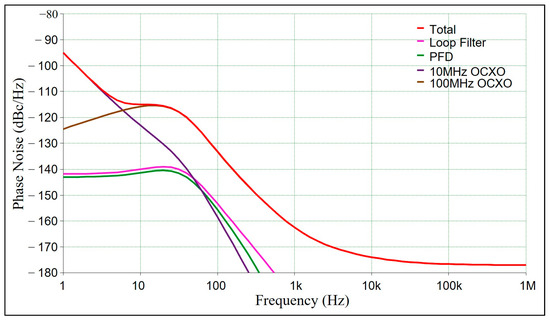 Phase noise simulation diagram of 100 MHz at 1 Hz–1 MHz frequency offset. The diagram shows that phase noise in the loop bandwidth is determined by 10 MHz OCXO, and the phase noise outside the loop bandwidth is determined by the 100 MHz OCXO.