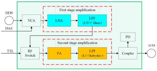 With the rapid development of laser cooling [1,2,3,4,5], the ultra-narrow linewidth laser [6,7,8,9], and the femtosecond optical frequency comb [10,11], optical clocks play an important role in the measurement of basic physical constants [12], the verification of general relativity [13,14], gravitational wave measurement [15,16,17], and other precise measurement physics [18,19]. In recent years, with the increasingly urgent demand for the next generation of second definition [20] and the measurement of the elevation difference [21,22], the miniaturization research of the key sensing components of the optical clock has been a widespread concern [23,24]. The working operation of optical clocks involves complex laser modulation technology, and radio frequency (RF) modules are indispensable for driving or modulating the acousto-optic modulators (AOMs) and electro-optic modulators (EOMs) in this process. Therefore, RF modules stand as a key component of the optical clock, and their miniaturization research is of great significance in meeting the requirements of transportable optical clocks.