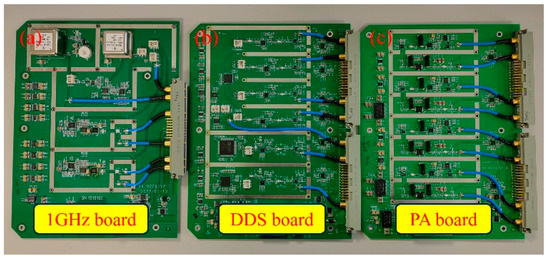 Mechanical–electrical joint design is adopted to improve the module’s integration. Three kinds of circuit boards are developed. A photograph of the PCB boards is shown in Figure 5. The size of the 1 GHz board is 170 mm × 230 mm × 40 mm, the DDS board is 170 mm × 230 mm × 20mm, and the PA board is 170 mm × 230 mm × 20 mm. The volume of the self-made circuit board is about 20% of that of a commercial one, which greatly reduces the occupied space and improves system integration.