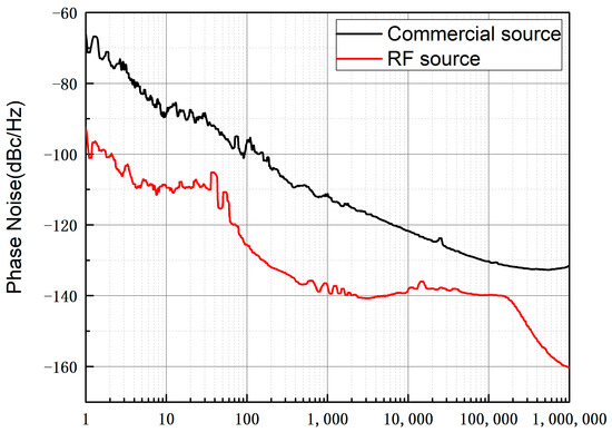 The phase noise of the RF module’s DDS board output signal was tested against the 100 MHz signal output from a commercial signal source (ARTIQ DDS Urukul card). The reference clock for both sources was a 10 MHz signal from the same hydrogen maser in the laboratory. The phase noise analyzer was set to a resolution bandwidth of 3%, a cross-correlation factor of 10, and a frequency offset range of 1 Hz to 1 MHz. The phase noise test plot is shown in Figure 6. The main reason for the better performance of the phase noise of the RF module is that the integrated VCO phase-locked loop is used to double the frequency of the crystal oscillator as the DDS reference signal, while the commercial signal source uses the integrated frequency multiplier in the DDS chip as the reference signal, which will lead to the phase noise deterioration of 10–20 dB.