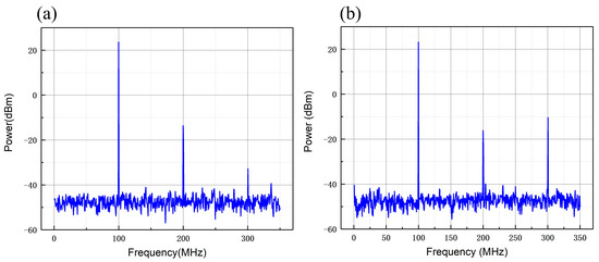 The output signal of the PA board and the commercial source (ZHL-1-2W-S+) are tested, respectively. We set the RF module’s DDS board output signal to 100 MHz, the resolution bandwidth of the phase noise meter to 100 kHz, the RF bandwidth to 100 kHz, the center frequency to 100 MHz, and the test frequency range to 300 MHz. The spectrum test diagram is shown in Figure 7. The test results show that when the output frequency is 100 MHz and the power amplification is 33 dBm (2 W), the third harmonic rejection ratio of the PA board is better than the commercial source by more than 20 dB.