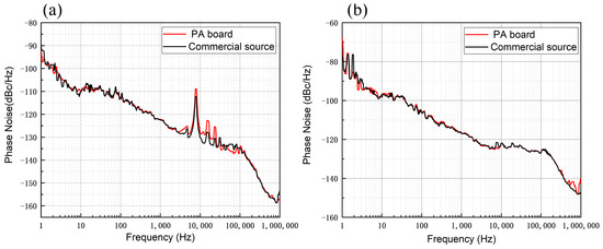 PA board and commercial module output phase noise test chart. (a) The phase noise comparison between PA board and commercial source when the output signal is 100 MHz; (b) the phase noise comparison between PA board and commercial source when the output signal is 400 MHz. At the output frequency of 100 MHz, the phase noise is better than that at the output frequency of 400 MHz at the frequency point of 1 Hz.