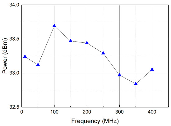 We then tested the output power of the PA board at different frequencies. We set the RF module’s DDS board output signal to 10–400 MHz and tested the output power of the PA board at different output frequencies. The relationship between the frequency and output power is shown in Figure 10. In the bandwidth range of 400 MHz, the output power fluctuation of the PA board is less than 1 dB.