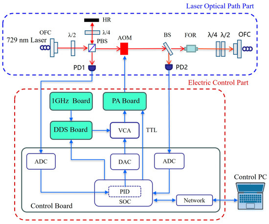 Figure 11 shows the functional block diagram of the experimental device. The whole experimental device consists of a laser optical path part and an electric control part, where the light path part consists of a quarter-wave plate (λ/4), a polarizing beam splitter (PBS), AOM (SGT80-729-1TA-B30), a faraday rotator (FOR, FR730-3-1.5W), etc. The electronic control part consists of a control board, a 1 GHz board, a DDS board, a PA board, etc. The control board uses a system on chip (SOC, XC7Z045) as the control chip, connects to the DDS board through the input/output port to configure the AD9912, collects the output signal of the photo detector (PD, S5972) through an analog–digital converter (ADC, AD9266), controls the voltage control attenuator (VCA, ZX73-2500M-S+) through the digital–analog converter (DAC, AD9747), controls the RF switch on the PA board through transistor–transistor logic (TTL), and the computer software connects to the control board through the network port to configure various parameters in the experiment.