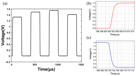 Sequential operation test chart. (a) is the laser power passing through the AOM can be changed by DDS, and the laser can be turned on and off. (b) Enlarged diagram of rising edge; (c) enlarged diagram of falling edge. The response time of the AOM is less than 6 μs.