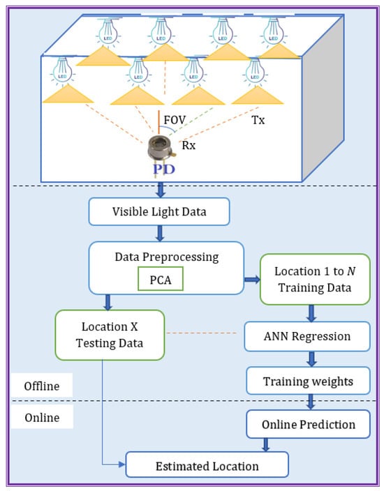 This paper presents the PCA-ANN regression model for an indoor visible light positioning system using intensity modulation and direct detection. The model aims to predict the numerical output variable, i.e., the position, based on RSS measurements. Figure 1 illustrates the schematic representation of this system. The process begins with multiple LEDs (transmitters, Tx) emitting visible light signals, which are received by a photodiode (receiver, Rx) within its field of view (FOV). This results in RSS measurements that are collected, labeled, and preprocessed for further analysis. To enhance efficiency and accuracy, PCA is applied to reduce the dataset’s dimensionality while preserving essential features. The dataset is then divided into two subsets: (i) Dataset 1 (training data), used to train the ANN model offline and PCA is first applied to Dataset 1 to extract principal components and streamline the dataset, and (ii) Dataset 2 (testing data), used in the online phase, where the PCA transformation derived from Dataset 1 is applied to ensure consistency and prevent data leakage. After preprocessing, the ANN is trained offline by optimizing its weights, enabling real-time predictions during deployment. During the online phase, the trained ANN model processes Dataset 2 and predicts the estimated receiver location based on the learned patterns. This workflow ensures a strict separation between training and testing datasets, guaranteeing reliable and unbiased model evaluation. Ultimately, the estimated position is determined based on insights gained from the analysis.