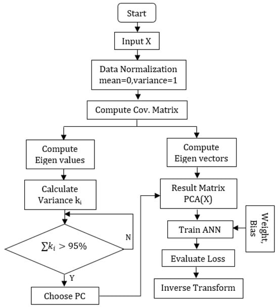 PCA enhances ANN learning by reducing dimensionality by simplifying data into orthogonal principal components. However, this reduction in complexity can come at the cost of performance if dominant contributions are removed. To balance model complexity and performance, selecting the optimal number of principal components is crucial. Figure 2 visually illustrates the flowchart for the PCA-ANN regression model, demonstrating the integration of PCA in preprocessing data to improve the efficiency and learning outcomes of the ANN.