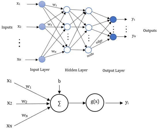 In this context, represents the activation function, b represents the bias, w represents the weights that encode the linear relationships in the connection matrices, represent the neuron inputs, and is the output. Each layer of the network intricately relies on its input, as depicted in Figure 3. The activation function plays a crucial role in introducing non-linearity to the network’s dynamics, adjusting the weighted sum from the input layer to the output layer across hidden layers []. When a neuron surpasses a specific threshold, it activates and transmits information to the next layer. Initially, all inputs traverse the input layer with random weights. The weighted sum is computed by multiplying each weight by its corresponding input value and summing the results. Introducing a bias b into this weighted sum is critical, as the resulting value undergoes the activation function. To dynamically adjust attributes of the neural network, such as weights and learning rate [], we are going to compare and select slightly better optimization techniques in our results. This iterative process continues as activated neurons are forwarded to subsequent layers, ultimately leading to the output layer where the final prediction is generated.