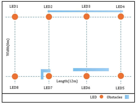 This section details experiments conducted using datasets from Raes et al. []. These datasets encompass measurements taken in a single indoor setting, specifically a hallway environment. Table 1 showcases the experimental system parameters. The experimental setup, illustrated in Figure 4, features eight LEDs arranged in a rectangular formation spanning 6 m by 12 m on the hallway ceiling, alongside various obstacles. To simulate real-world conditions, obstacles in Figure 4 were placed at a height of 1.5 m, designed to partially attenuate rather than completely block light signals. These obstacles introduce variations in received signal strength, which is essential for evaluating positioning accuracy in dynamic environments. The controlled inclusion of obstacles ensures the dataset captures realistic challenges, improving model robustness. For the VLP receiver, a custom photodiode module with a programmable system-on-a-chip (PSOC) was utilized.