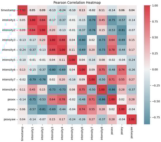 To emphasize the significance of PCA before training our dataset with ANNs, we leverage the Pearson correlation coefficient (PCC) heatmap []. This visual tool serves as a pivotal preparatory step, highlighting correlations between LED intensities and pose coordinates within our visible light positioning system. By scrutinizing the PCC heatmap, we discern intricate patterns and relationships among variables, which are essential for reducing dimensionality through PCA. Here, X represents input variables including timestamps and the intensities of eight lights, while Y denotes target variables consisting of pose coordinates (posex, posey, poseyaw). The formula for , i.e., the PCC between X and Y, is
