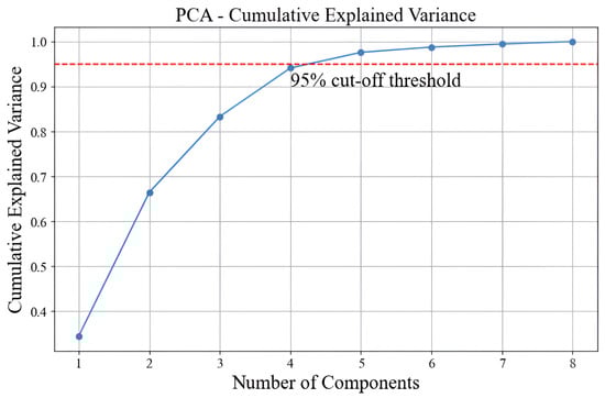 Building on the findings from Figure 5, this study employed PCA for dimensionality reduction. Table 2 presents the results of a PCA conducted on a dataset, summarizing the explained variance by each principal component (PC), their eigenvalues, and both the individual and cumulative variance contribution rates (CR and Cumulative CR). The first principal component (PC1) accounts for 35.3% of the total variance with an eigenvalue of 2.757. Adding the second principal component (PC2), which explains an additional 32.8% variance with an eigenvalue of 2.558, the cumulative variance reaches 68.1%. Including the third component (PC3) brings the total to 85.4% with an eigenvalue of 1.350. The fourth component (PC4) adds 11.1% variance, increasing the cumulative total to 96.4%, which surpasses the 95% cutoff threshold we set for our analysis. This indicates that the first four principal components are sufficient to capture over 95% of the total variance in the dataset, making them a suitable choice for dimensionality reduction. This selection helps to simplify the dataset while preserving most of the original information, facilitating more efficient and effective modeling.