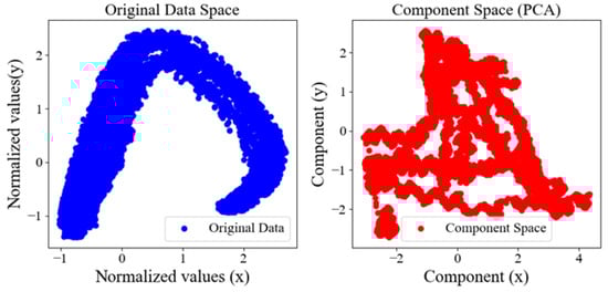 Table 2 presents the explained variance ratio for the first four principal components (PCs), which meet the 95% cut-off threshold. A similar result is obtained for the total variance, which is shown in Figure 6. Furthermore, here, four principal components are required to have a total variance of over 90%. In other words, we can reduce the dimensionality of the dataset from eight RSS measurements to four principal components while retaining most of its variance. This simplification enhances the performance of ANN by focusing on the most informative data aspects. Figure 7 compares data in its original form with its transformed state after applying PCA. In the original data space plot, blue dots represent observations based on two normalized features, forming a distinct arch-like shape indicative of a non-linear relationship. This plot highlights the complexity and structure of the raw data. In the component space (PCA) plot, red dots represent the same observations transformed into a lower-dimensional space defined by x and y components. This transformation simplifies the data, capturing the most significant variance while retaining the underlying structure. The comparison illustrates PCA’s role in simplifying complex data while preserving critical information.