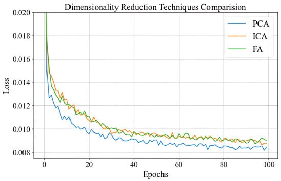 Independent component analysis (ICA) and factor analysis (FA) are linear dimensionality reduction techniques commonly applied in regression tasks, each with distinct methodologies []. ICA focuses on decomposing a dataset into statistically independent components, making it particularly useful for applications such as signal separation. In contrast, FA models observed variables as linear combinations of underlying latent factors, emphasizing the covariance structure of the data. While both techniques are effective in specific domains, they are less efficient than principal component analysis (PCA) in terms of variance capture and computational performance. As illustrated in Figure 8, PCA consistently outperforms ICA and FA in reducing loss over 100 epochs when applied as a dimensionality reduction method for a neural network model. PCA begins with a lower initial loss of approximately 0.018 and quickly decreases to about 0.009 within the first 20 epochs. In comparison, ICA and FA start with slightly higher initial losses of approximately 0.019 and reduce more gradually, reaching 0.010 and 0.011, respectively, by the 20th epoch. Over the full training period, PCA achieves a final loss of approximately 0.0085, outperforming ICA (0.0095) and FA (0.0098).