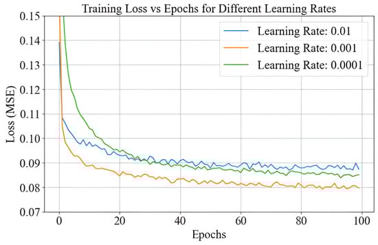 The learning rate is a hyperparameter in neural network training that determines the step size for weight updates during optimization. It is essential to balance convergence speed and stability, ensuring effective learning without overshooting or stagnating []. A high learning rate can cause instability, resulting in fluctuations or divergence, while a low learning rate slows convergence or traps the model in suboptimal solutions []. Figure 9 shows the training loss over 100 epochs for a neural network trained with three learning rates (0.0001, 0.001, and 0.01). Initially, all learning rates show a rapid decrease in training loss, indicating effective initial learning. However, their behaviors diverge as training progresses. A learning rate of 0.001 achieves the best balance between speed and stability, stabilizing at the lowest training loss. This is because the moderate step size allows the optimizer to make consistent progress toward the minima, navigating both sharp and flat regions of the loss surface effectively. In contrast, a learning rate of 0.0001 results in smaller weight updates, leading to slower progress and convergence at a higher loss value, as the model struggles in flat regions or shallow gradients. Meanwhile, a learning rate of 0.01 causes large weight updates that overshoot the minima, resulting in significant fluctuations and difficulty in achieving convergence. These observations highlight the importance of selecting an appropriate learning rate in the PCA-ANN framework. A moderate learning rate of 0.001 ensures effective optimization by balancing step size and stability, enabling smooth convergence. In contrast, excessively high or low learning rates hinder the optimizer’s ability to navigate the loss surface efficiently, reducing the model’s performance.