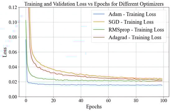 In this section, we compare the performance of various optimization algorithms, including adaptive moment estimation(Adam), root mean square propagation (RMSProp), Adagrad, and stochastic gradient descent (SGD), to determine which optimizer facilitates quicker and more effective convergence during training. Optimizers are a crucial part of the model training process, as they adjust the model parameters to minimize the loss function, ultimately improving the model’s ability to learn from data and generalize to new, unseen data. The optimization algorithm is applied during the training phase, after initializing the model and setting up the architecture (in this case, the PCA-ANN model). It operates in each iteration to adjust the weights and biases of the network in response to the gradients calculated from the loss function, effectively driving the model toward the optimal solution. Adam is particularly effective due to its adaptive learning rate and momentum, which help it navigate the loss surface more efficiently []. RMSProp adapts the learning rate based on the moving average of recent gradient magnitudes, making it effective for handling non-stationary objectives. Adagrad, which adjusts the learning rate based on gradient frequency, works well for sparse data by making larger updates for infrequent parameters and smaller ones for frequent parameters. SGD, the most basic optimization algorithm, uses the gradient of the loss function to update parameters based on small mini-batches. Figure 10 illustrates the performance of these optimizers with the MSE loss function across 100 epochs at a learning rate of 0.001. The results indicate that Adam outperforms the other optimizers by achieving significantly lower MSE values, particularly in the early stages of training. This is because Adam combines momentum, which smooths the updates by incorporating past gradients, with adaptive learning rates, allowing it to handle large and noisy gradients effectively. In the initial epochs, when gradients are more volatile, Adam’s ability to adjust the step size dynamically ensures faster convergence compared to other optimizers, such as SGD and Adagrad, which rely on fixed or decaying learning rates. By maintaining stability in high-gradient regions and avoiding oscillations in flat areas of the loss surface, Adam achieves both speed and precision in optimization. This observation is consistent with Figure 10, where Adam’s curve demonstrates the steepest initial drop in loss, stabilizing at the lowest final value. In contrast, SGD exhibits the slowest convergence, maintaining relatively high loss values throughout training. RMSProp and Adagrad show moderate performance, converging faster than SGD but failing to match Adam’s efficiency. Although all optimizers eventually converge to similar MSE values, Adam’s faster reduction in MSE highlights its efficiency in minimizing the loss function. As a result, Adam was selected for use in the PCA-ANN model to ensure more efficient and effective optimization, ultimately enhancing model performance and reducing training time.