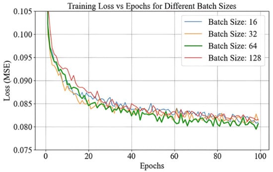 The plot in Figure 11, illustrates the training loss (MSE) across epochs for different batch sizes (16, 32, 64, and 128), highlighting how batch size influences the convergence dynamics and the final performance. As the batch size increases, the loss curves become smoother, with reduced variability and more stable convergence []. However, larger batch sizes require more memory and computational resources, which can pose challenges in constrained environments. Conversely, smaller batch sizes introduce greater variability in gradient updates, aiding exploration of the loss surface and helping to find flatter minima that generalize better []. However, this increased variability can lead to slower and less consistent convergence due to noisier optimization. For our PCA-ANN model, a batch size of 64 was selected as it strikes an effective balance between training stability and efficient convergence. The plot shows that it provides smooth and steady convergence with minimal fluctuations compared to smaller batch sizes such as 16 and 32, ensuring stable and reliable gradient updates. It also avoids the poor generalization typically associated with large batch sizes, like 128, which tend to converge to sharp minima. Additionally, a batch size of 64 optimizes computational resource usage, making it suitable for our system constraints. This choice enables the model to achieve robust training performance and effective generalization while maintaining convergence stability and computational feasibility.
