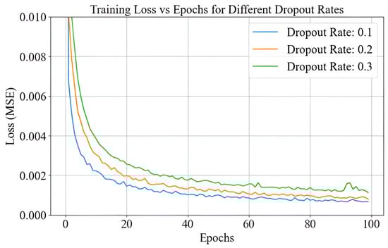 Dropout is a regularization technique used in neural networks to prevent overfitting by randomly deactivating a proportion of neurons during training. The dropout rate refers to the fraction of neurons that are randomly set to zero during each training step. A higher dropout rate deactivates more neurons, increasing the regularization effect, while a lower rate retains more information in the network []. Based on the analysis of the dropout rates shown in Figure 12, a dropout rate of 0.1 was selected as the optimal choice for our PCA-ANN model. This decision was made because, among the tested rates (0.1, 0.2, and 0.3), the 0.1 rate consistently resulted in the lowest training loss over 100 epochs. It allowed the model to generalize effectively without excessively discarding valuable information. As the dropout rate increased to 0.2 and 0.3, stronger regularization was introduced, but this also led to higher training losses, particularly in the early epochs. This behavior suggests that higher dropout rates hindered the model’s ability to capture important patterns in the data. Since PCA already reduces dimensionality and minimizes noise, applying high dropout rates on top of this was detrimental. These higher dropout rates restricted the amount of information passed through the network, making it harder for the model to learn important features. Thus, a dropout rate of 0.1 provided the best balance between regularization and learning stability, promoting effective generalization while allowing the network to retain its ability to capture meaningful patterns in the data.