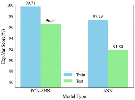 Figure 13 shows the explained variance score (EVS) for the training and testing phases of both models, highlighting the PCA-ANN model’s better predictive performance. EVS measures how well the model explains the variability in the data, with higher values indicating better model accuracy. The PCA-ANN model achieves an EVS of 99.71% for training and 96.55% for testing, demonstrating strong data pattern recognition and predictive accuracy. In comparison, the ANN model has slightly lower EVS values of 97.29% for training and 91.80% for testing. These results confirm the PCA-ANN model’s enhanced accuracy and reliability over the standard ANN model in both phases.