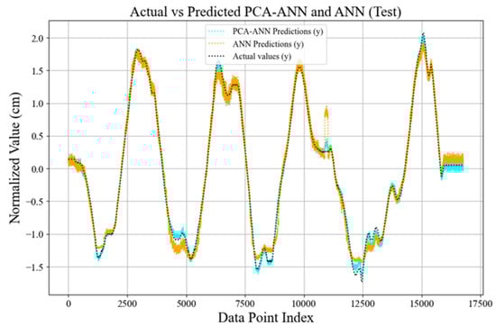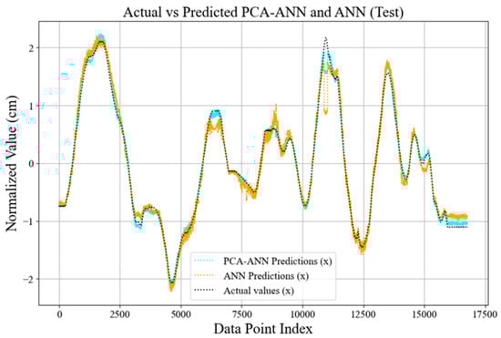 The comparative plots in Figure 14 and Figure 15 illustrate the performance of the PCA-ANN model versus the traditional ANN model in predicting the test data set values. The predictions of both models for the coordinates x and y are plotted alongside the normalized actual values, which represent the ground truth values derived from the test dataset and are scaled during pre-processing. In Figure 14, the actual values represent the ground truth x coordinates obtained from the test dataset, which has been normalized during pre-processing to ensure consistent scaling and compatibility with the model’s training framework. These values are used as the benchmark for assessing the accuracy of the model’s predictions. The predicted values are the output generated by the PCA-ANN and ANN models, reflecting the estimated x coordinates based on the learned patterns from the input data. The plot demonstrates that the PCA-ANN model aligns more closely with the actual values compared to the ANN model, especially in regions with rapid fluctuations, indicating its improved stability and accuracy in predicting test data. In both figures, the PCA-ANN model consistently demonstrates smoother convergence toward the actual values with fewer fluctuations than the ANN model. This indicates that PCA-ANN captures patterns with greater stability, likely due to the dimensionality reduction provided by PCA, which enhances generalization and reduces overfitting. For the y-coordinates (Figure 15), the PCA-ANN predictions closely align with the actual values across most data points, showing improved accuracy and reduced noise relative to the ANN model. Similarly, for the x-coordinates (Figure 14), the PCA-ANN predictions exhibit a closer match to the actual values, particularly in regions with rapid fluctuations. These results validate the effectiveness of our model in enhancing predictive performance by balancing accuracy and computational efficiency.