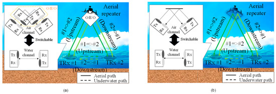 Recent research has investigated the use of aerial platforms to address these challenges. For instance, ref. [26] demonstrated optical wireless communication between underwater and aerial drones, leveraging the aerial channel’s relative stability to improve overall communication robustness. While this approach shows promise, it has not been optimized for dynamic environments where underwater conditions fluctuate rapidly.