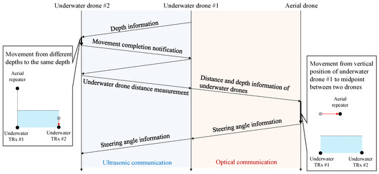 Following the transmission of depth information between underwater drone #1 and underwater drone #2 via ultrasonic communication, a crucial movement completion notification is sent. This notification, also using ultrasonic communication, is a key step in the process, as it confirms the successful execution of a movement. The process continues by calculating the distance between the underwater drones, which is measured and shared through ultrasonic communication. Subsequently, the precision of the distance and depth information is highlighted. It is transmitted between underwater drone #1 and the aerial drone using optical wireless communication, leveraging its high-speed and reliable data transmission capabilities across the water-to-air boundary. For proper navigation and alignment, steering angle information is exchanged in two ways. This dual-mode approach, between the underwater drones via ultrasonic communication and underwater drone #1 and the aerial drone via optical wireless communication, is a significant factor in ensuring accurate and synchronized operations across water and air environments.