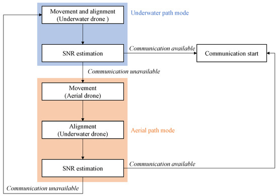 Figure 5 summarizes the operational flow of the drive and communication systems when switching between underwater and aerial optical paths for both underwater and aerial drones. Initially, the underwater drones adjust their positions and alignments. Channel estimation is then performed to measure the received SNR. If the SNR allows communication, the system initiates transmission. The system switches to the aerial optical path if the channel estimation determines that even the lowest-order adaptive modulation is infeasible. The aerial relay node, corresponding to an aerial drone, moves horizontally and vertically. After adjusting the beam steering angles, channel estimation is conducted again. If the lowest-order modulation is feasible, communication begins. If deemed infeasible, the underwater drones adjust their positions vertically or horizontally to improve the received SNR and revert to the underwater optical path, repeating the process until successful communication is achieved.