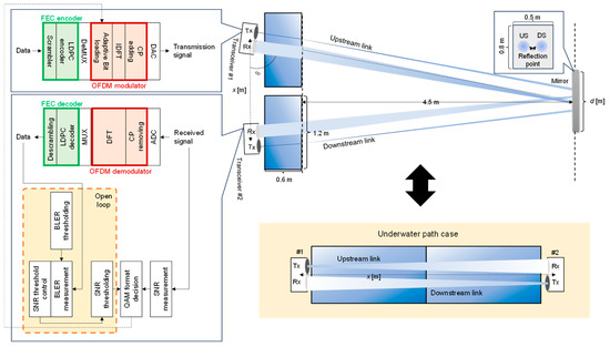 - Kodama, T.; Arai, K.; Nagata, K.; Nakamura, K.; Hanawa, M. Underwater wireless optical access network with OFDM/SBMA system: Concept and demonstration. In Proceedings of the Opto Electronics and Communications Conference/Photonics in Switching and computing (OECC/PSC), WP4-B5, Fukuoka, Japan, 7–11 July 2019. [Google Scholar]