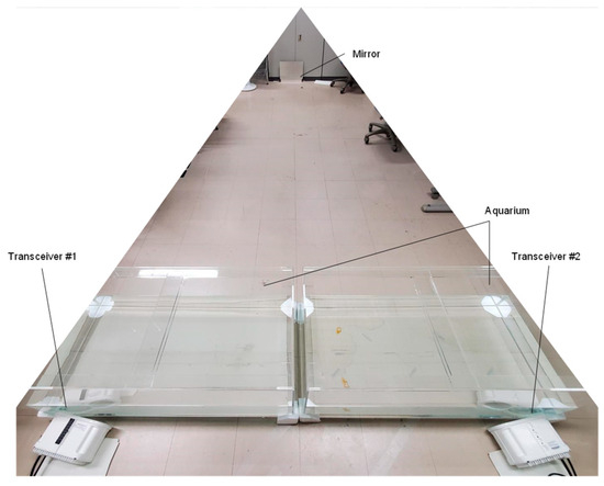 For the underwater optical path, the transmission distance of the underwater channel is modified by changing the tank’s length, width, or number of traversal stages. For the air optical path, the orientation of the tank and the position of the silvered glass mirror is fixed. At the same time, the transmission distance is varied by adjusting the distance x between the optical wireless transceivers and the steering angle α. The water tank is filled with either tap water or seawater with a turbidity of 2.2 nephelometric turbidity units (NTUs). This study measured turbidity using a turbidity meter (KY HOPE, WGZ-1B) based on the principle of light scattering. The unit of turbidity, 1 NTU, is the turbidity of 1 L of purified water containing 1 mg of formazin standard solution [33].