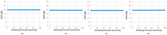 Dynamic SNR characteristics in uplink for (a) 0.6 m, (b) 1.2 m, (c) 1.8 m, (d) 2.4 m.