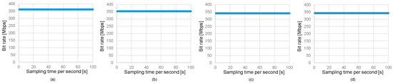 Figure 11a–d show the dynamic bit rate characteristics over 100 s in a shallow water channel under the same conditions as Figure 9, where the transceiver distance in the aerial path varies from 0.6 m to 2.4 m in increments of 0.6 m. The stability of the bit rate demonstrates the robustness of the system’s adaptive beam steering mechanism, ensuring reliable alignment and data transmission.