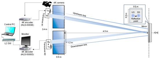 Figure 12 illustrates the experimental setup for 4K UHD video stream transmission in a full-duplex optical wireless communication system emulating underwater/air optical path switching. The conditions for the air and underwater channels, optical transceivers, and mirrors in this experiment are the same as described in Section 3.