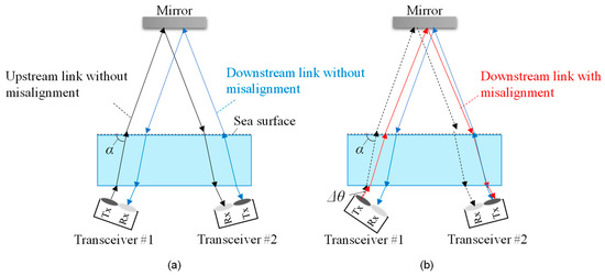 Figure 1a,b illustrate the architecture of a bidirectional UWOC system capable of switching between underwater and aerial optical paths, with and without optical/electrical/optical (O/E/O) conversion in the aerial optical relay. Latency varies depending on the O/E/O configuration. In O/E/O relays without digital signal processing, the delay caused by analog processing alone is minimal, typically limited to a few microseconds [31]. Consequently, for transmissions over several meters, both O/E/O relays and mirror-based relays are dominated by propagation delay, typically on the order of several hundred microseconds. Table 1 summarizes the characteristics of these configurations. The O/E/O relay requires a power supply for active signal processing, whereas the mirror-based relay requires no power supply for communication-related operations. Mirror-based relays outperform O/E/O relays regarding cost, weight, and power consumption. However, O/E/O relays have the advantage of signal regeneration and optical power gain after optical relaying, particularly when the transmission distance of the aerial optical path increases. Nevertheless, the transceivers in the optical relay must be aligned with the steering angles of the underwater optical transceivers, resulting in complex optical axis alignment. Therefore, mirror-based relays are better suited for shallow water environments where underwater drones can maintain sufficient transmission power through aerial channels when positioned near the water surface.