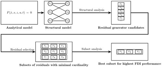 - Residual selection: Subsets of residuals with minimal cardinality, capable of detecting and isolating all considered faults, are formed using a residual selection algorithm.