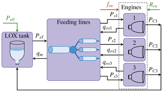 The multi-engine cluster model considered here was first presented in [31] with a smaller range of possible faults. It considers the LOX side of the cluster and comprises three subsystems: a LOX tank, feeding lines, and rocket engines. The cluster contains three identical Liquid-Propellant Rocket Engines (LPREs). A scheme of the simulation model of the cluster, containing all subsystems and the interactions between them, is illustrated in Figure 2.