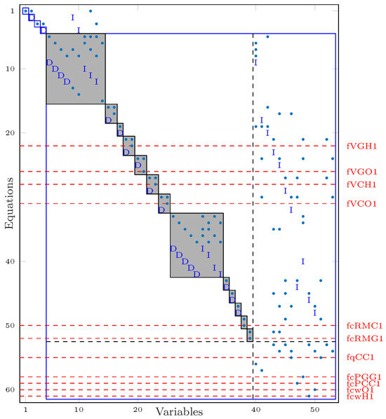 DM decomposition is depicted in Figure 3. The equations in the overdetermined part are confined within the large blue rectangle. All considered faults impact equations localized in the overdetermined part and can, thus, be detected. The structural isolability of the faults is defined by the gray rectangles called equivalent classes. A group of equations in the same equivalent class is necessary to build an overdetermined set, i.e., two faults affecting the same equivalent class cannot be structurally isolatable. From Figure 3, the selected faults can be isolated, with each one affecting different equivalent classes.