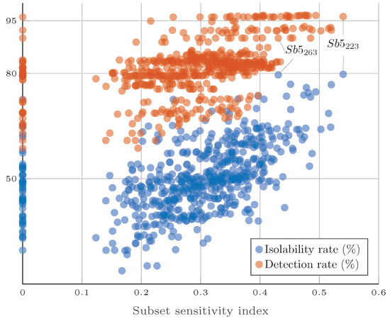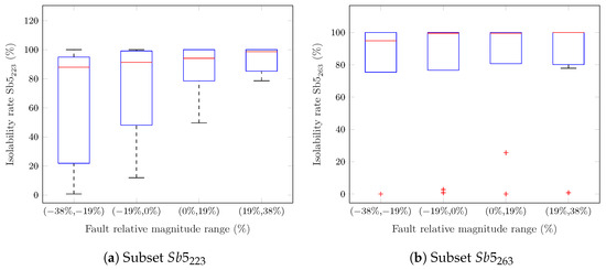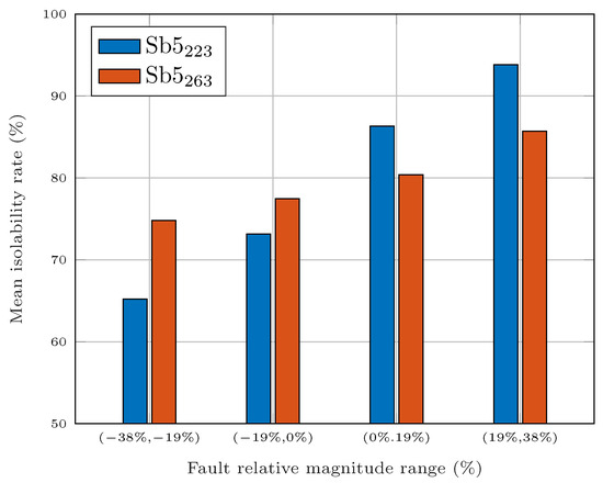 Fault isolation is performed by analyzing the fault signature. If a perfect match between the theoretical fault signature and the observed fault signature is not observed, a new method is proposed to isolate the most probable fault present in the system. One common method is to use the closest fault signature, as described in [35] and applied in [36] for fault isolation in wind turbines. The main drawback is that, depending on the observed fault signature, it may return a list of probable faults. The problem of finding the most probable fault was also addressed in [37], where a ‘consistency index’ was used. The index is calculated using the probability distribution of the residual signal by quantifying how confident the signal is in its nominal (or fault-free) condition. However, it does not account for the different fault sensitivities of the residuals. A method that considers the numerical fault sensitivity was proposed in [38], where the sensitivity of the residuals was calculated considering the partial derivative of the residual with respect to the fault. While powerful, this solution requires the analytical expression of the residuals. Inspired by the solution proposed in [38], we also propose the use of the RSI, which was first calculated to select the most sensitive subsets, for fault isolation to identify the most probable fault present in the system.