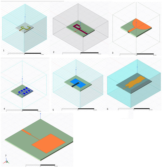 (1) Two C-shaped antennas. (2) F-shaped antenna. (3) Ultra-wideband antenna. (4) Zig-zag multiband antenna. (5) Dual-band microstrip antenna. (6) Dual-band antenna. (7) Regular patch antenna. (The gray shade in all subfigures represents the layer of non-copper material, while all other colors represent the layer of copper conductors for the top layer).