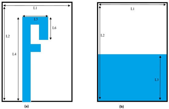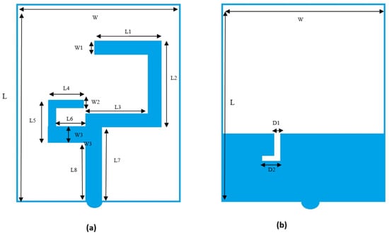 The primary purpose is to design a compact, easy-to-manufacture, cheap, and high-performance microstrip patch antenna. The antenna is printed on the substrate of FR4 with two C-shaped strips, as shown in Figure 2a, and a microstrip feed line on the front side. There is an L slot in the ground plane on the bottom side, as shown in Figure 2b. The overall geometric size of the antenna is 29 × 26 × 1.6 mm3. The antenna bandwidth is 140 MHz and 552 MHz at 2.45 GHz and 5 GHz, respectively.